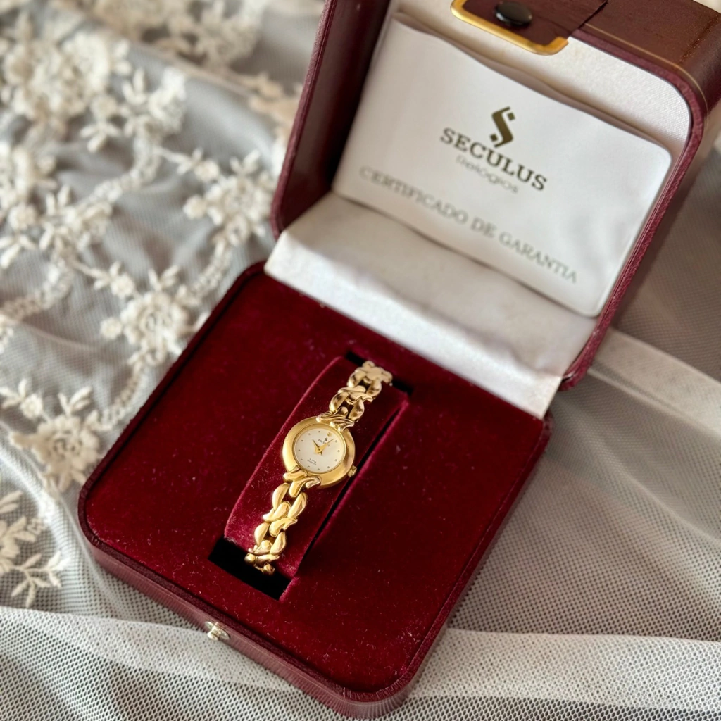 Delicadíssimo Seculus dos anos 90. Pulseira e caixa em aço inoxidável com banho de ouro preservado. Funcionamento quartzo, em estado de novo, acompanha certificado de garantia da época da 1a compra (2002) e estojo original, achado raríssimo!